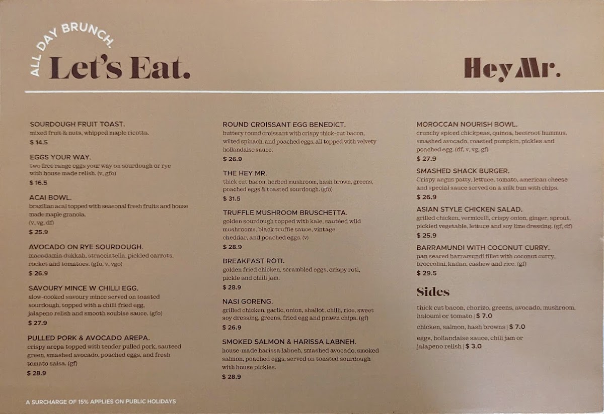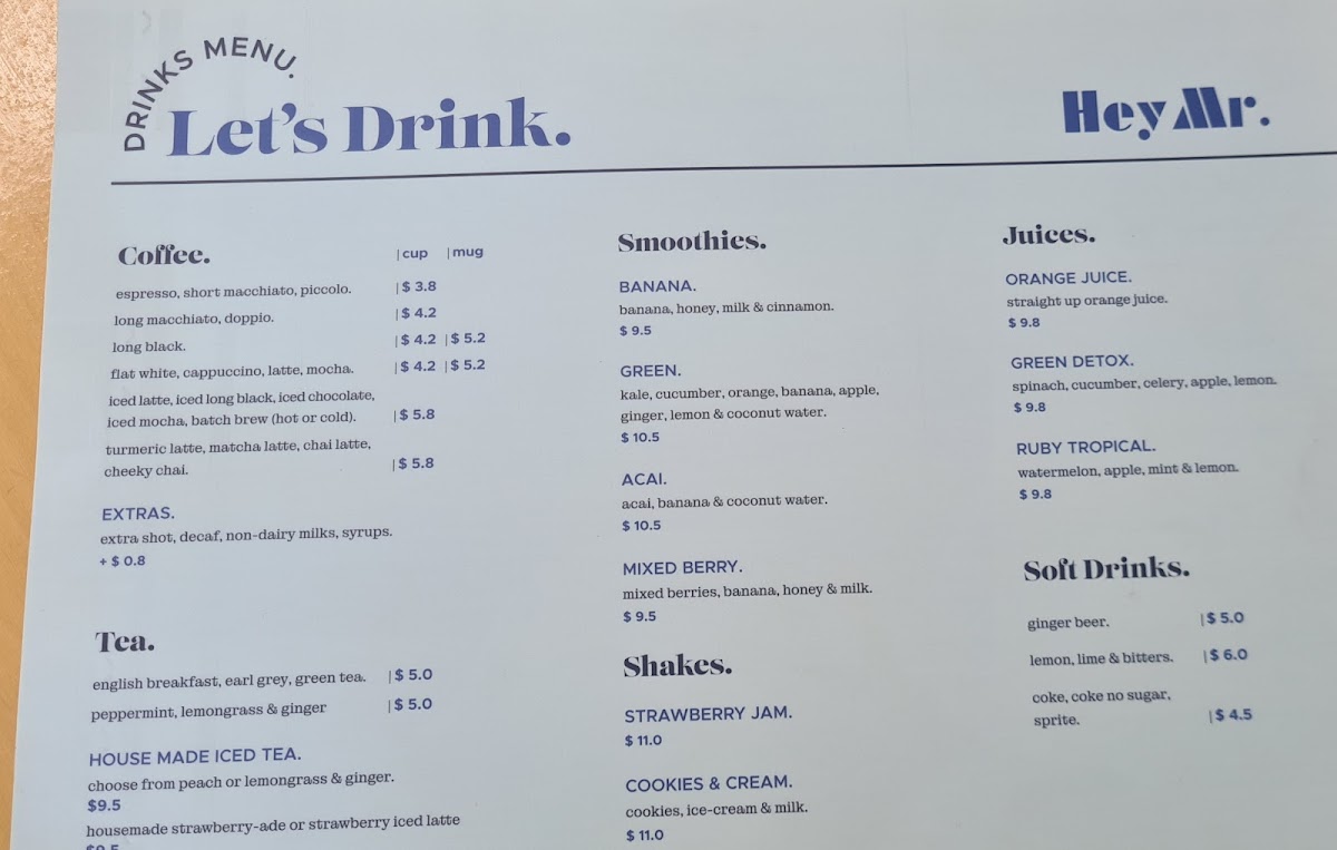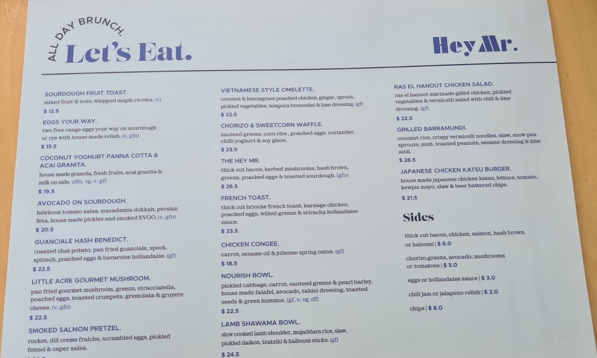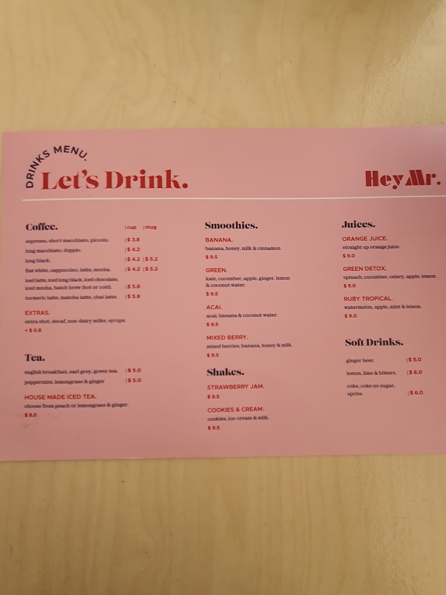 The menu at Hey Mr. New Farm features a variety of options suited for breakfast, brunch, and light meals. It includes a selection of hot and cold beverages, savory dishes, and light bites that accommodate different tastes and preferences.