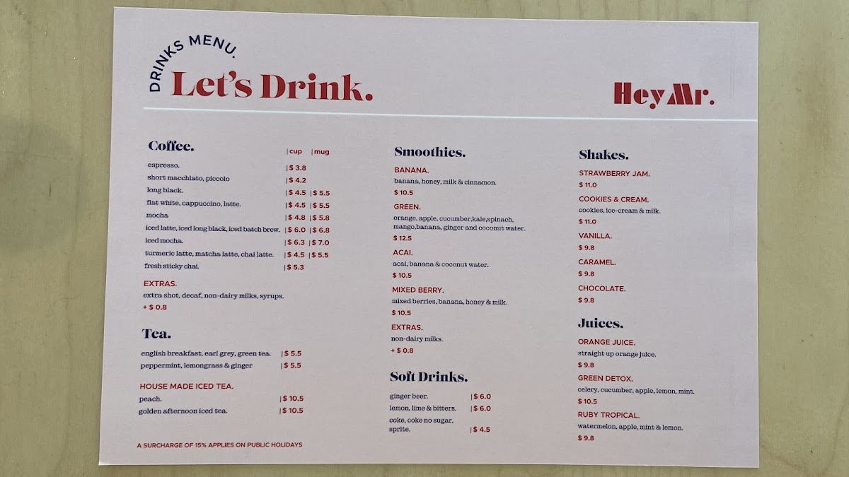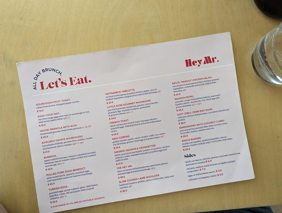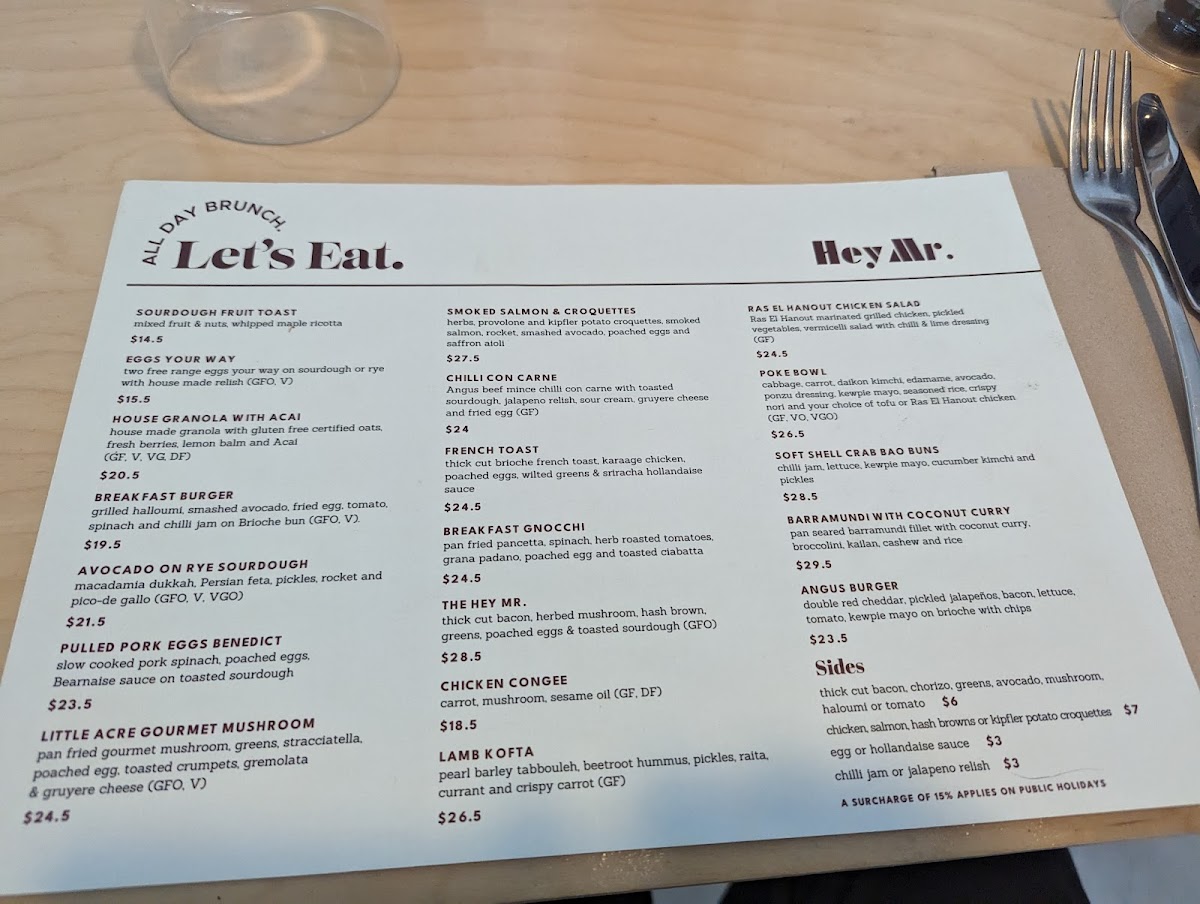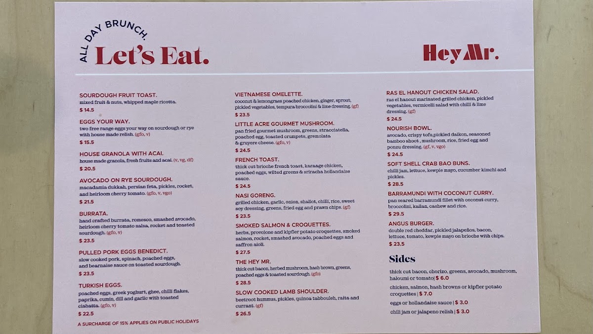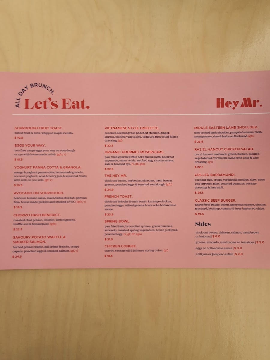 The menu at Hey Mr. New Farm features a variety of options suited for breakfast, brunch, and light meals. It includes a selection of hot and cold beverages, savory dishes, and light bites that accommodate different tastes and preferences.